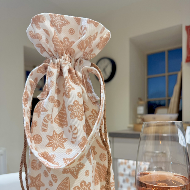 Featuring a boxed bottom to make the bag stand better when filled, a drawstring above the bottle to keep the contents secret and a really secure carry handle so you don’t drop and break your wine!